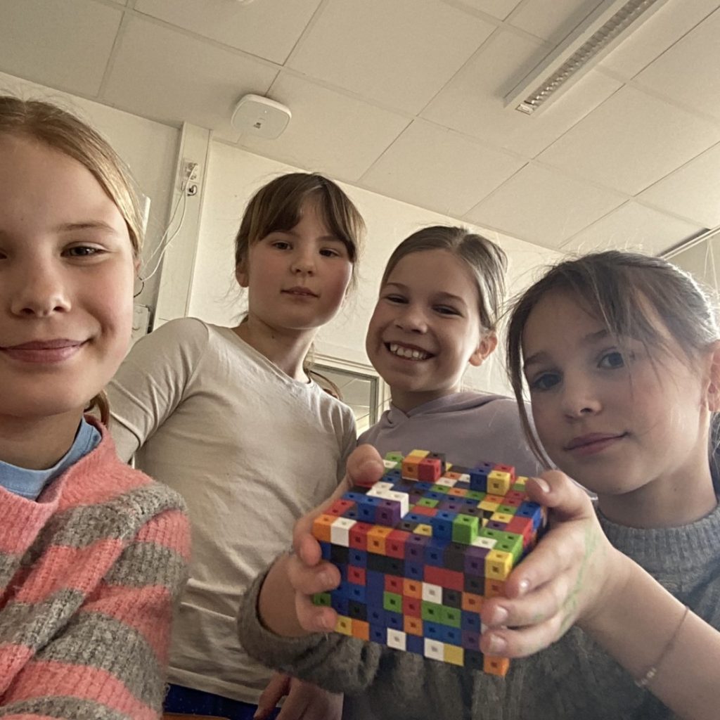 CENTICUBE-KLODS Man må nogle gange tænke uden for boksen, når man skal planlægge nye rekordforsøg. Freja Rose Greve, Pi Møller Thystrup, Kaisa Peters og Nora Rude Kynde fra 4. årgang havde forsøgt at komme med idéer til, hvordan de hurtigst kunne bygge en klods. Først forsøgte de sig med LEGO-klodser, men da den plan faldt til jorden, kom de på den fikse idé at forsøge med Centicubes. Centicubes er små klodser på 1 × 1 × 1 cm, man kan sætte sammen. På kun 10 minutter og 3,92 sekunder fik de samlet en klods på 9 × 9 × 9 cm, med et ekstra lag af 4 stk. 4 × 4 cubes. De brugte i alt 583 cubes. Eleverne siger: “Det tog os mange forsøg at finde en god måde at bygge den på. Vi lavede plader, der var 9 × 9 cm, og satte dem oven på hinanden. Det var rigtig sjovt, da vi skulle fremlægge det for andre. Pi kom hele tiden til at sige Rubiks Cubes i stedet for Centicubes.”
