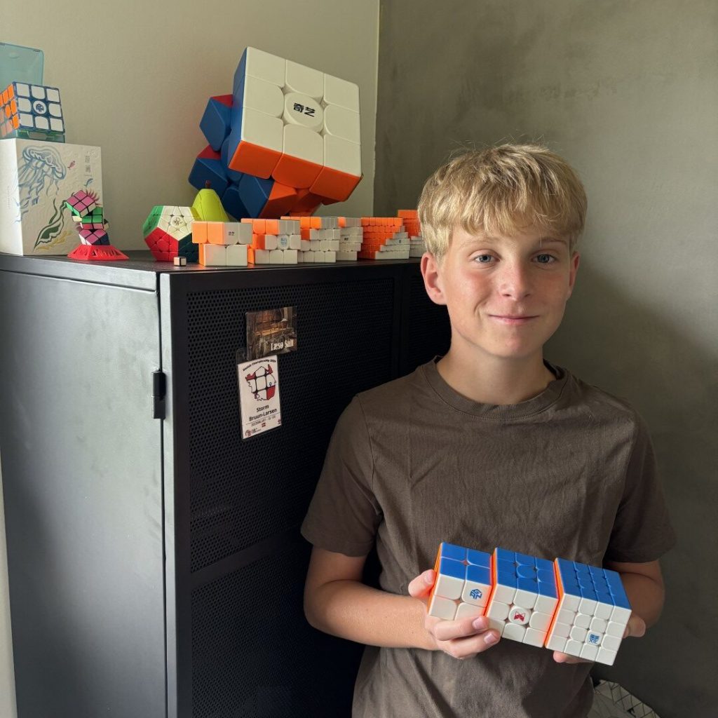 RUBIKS 2 × 2 × 2 + 3 × 3 × 3 + 4 × 4 ×4 +S272Så blev rekorden endelig slået! 13-årige Storm Bruun-Larsen samlede 2 × 2 × 2 og 3 × 3 × 3 og 4 × 4 × 4 Rubiksterning med en samlet tid på kun 55,78 sekunder. Det slår den tidligere rekord på 56,61 sekunder sat af Birk Jønch- Clausen fra Odense. Alle terninger blev blandet på cstimer.net (234 relay), så det var helt uvildigt. Ingen i huset var i tvivl, da rekorden kom i hus. Der var stor glæde og jubel. Storm fotæller: “I sommerferien i 2023 samlede jeg for første gang en 3 × 3 cube under en ferie hos mormor og har været bidt af cubing lige siden. Første milepæl var 3 × 3 på under 1 minut, og herefter skulle der ekstra udfordringer til. Jeg øver nu dagligt med både 2 × 2, 3 × 3, 4 × 4 og 5 × 5 og går til konkurrencer, så snart det er muligt. Rekordforsøget blev lavet over flere dage. Der var mange forsøg, som var virkelig tæt på den nuværende rekord, og det har krævet pauser i form af gåture og hop på trampolin for at få ærgrelserne ud af kroppen og være klar til nye forsøg. I starten var min mor med til at optage forsøgene, men som timerne og dagene gik, blev kameraet i stedet sat op på et stativ, så jeg selv kunne lave forsøg.”