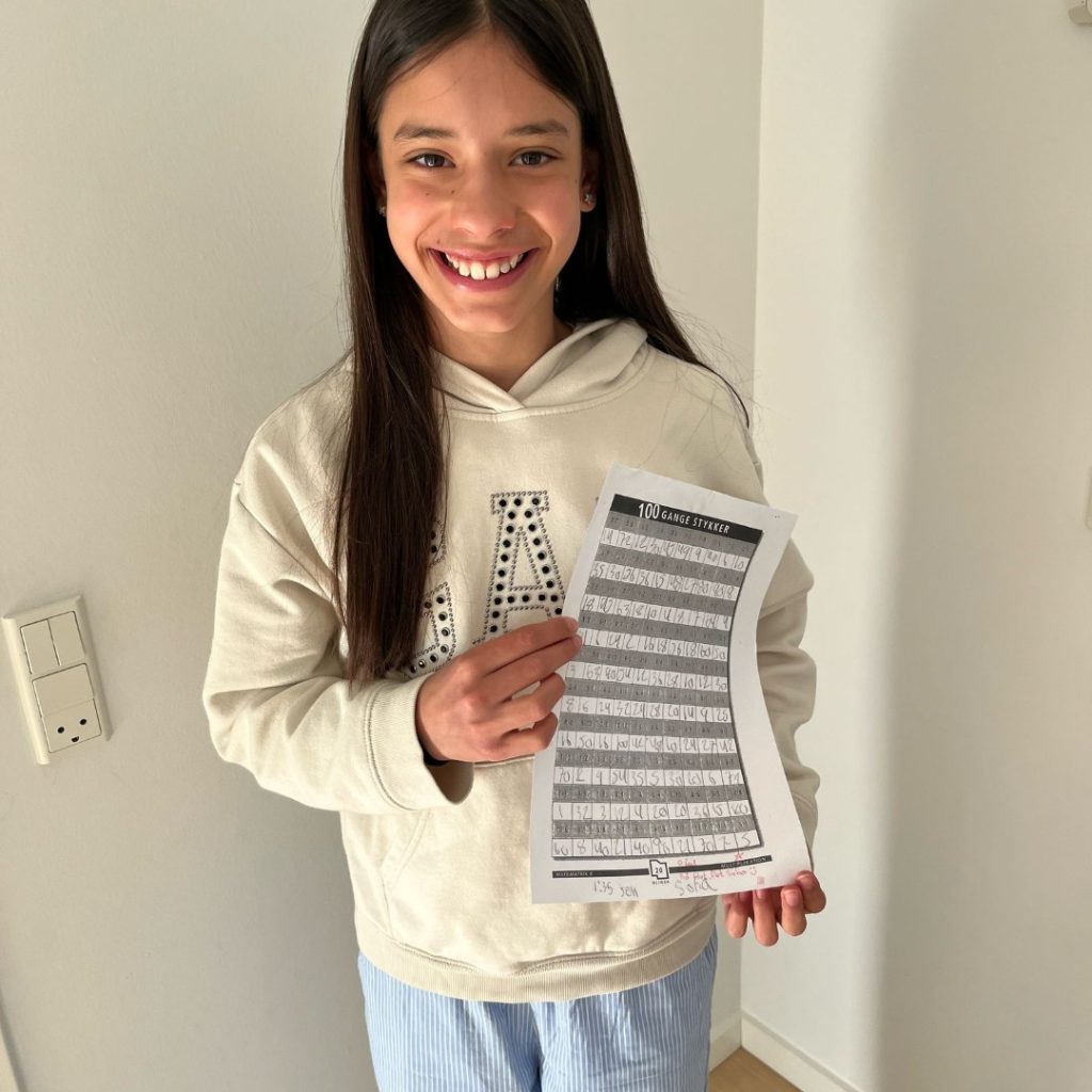 GANGESTYKKER På sin nye skole i 5. klasse ville 11-årige Sofia Buldo Fadista slå alles rekorder i de 100 gangestykker. Det gjorde hun ved at gennemføre 100 gangestykker på 1 minut og 35 sekunder, som er registreret af hendes skolelærer. Sofias mor Patrizia fortæller: “Det hele startede i 1. klasse. Læreren sagde, at de skulle lave 100 gangestykker på tid, og Sofia begyndte at øve tabellerne meget fra den dag. Hun blev virkelig optaget af det og fik en tid på 3 minutter og 16 sekunder. Hun blev glad, men hun vidste, at hun kunne gøre det bedre. Midt i 5. klasse skulle hun gøre det igen. Hun blev nervøs, men øvede sig flittigt. Dagen før testen fik hun en tid på 1 minut og 24 sekunder (uden vidner). Dagen kom, og hun var meget nervøs og fik tiden på 1 minut og 35 sekunder – men hun var alligevel glad. Læreren havde desværre kun set hendes tid i klassen, så det var den, der talte. Men det vigtigste af alt var, at Sofia var glad og tilfreds.”