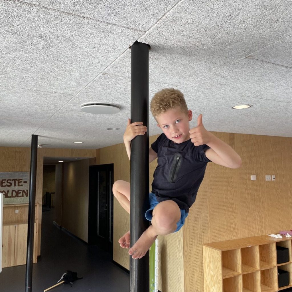 LODRET STANG En bomstærk pige er 7-årige Naia Lauge Broed. Hun har sat rekorden i at hænge på en lodret stang på 9,5 cm i diameter i intet mindre end en hel time. Det samme har udholdende Lukas Emil Westergaard Taasby på 9 år. Den gamle rekord er på 3 minutter og 54,84 sekunder sat af Sigrid Mainz Mosing fra samme SFO. Vores regionsleder Kåre Ravnskov siger: “Naia fra 1. A hang i skarp konkurrence med Lukas fra 3. A. De havde sikkert hængt der endnu, hvis ikke jeg havde stoppet dem efter 1 time.” Her blev rekorden sat: Loftet i køkkenet er støttet af nogle lodrette jernrør, der måler 2,3 meter i højden og 30 cm i omkreds.