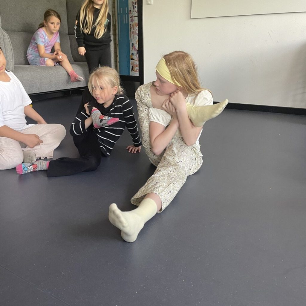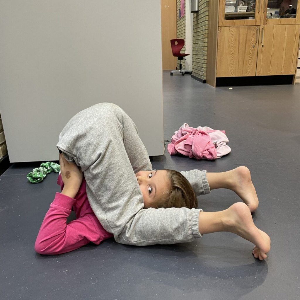 LIGGE – KRØLLET SAMMEN Der blev kæmpet om at opnå rekord i denne særprægede disciplin: at ligge med skuldrene i gulvet og knæene i gulvet over hovedet. 7-årige Evelill Hjorslev Hofman Zielinski endte med rekordtiden 20 minutter og 1 sekund, og Victoria Klüge Brink på 8 år lå i stillingen i 10 minutter.