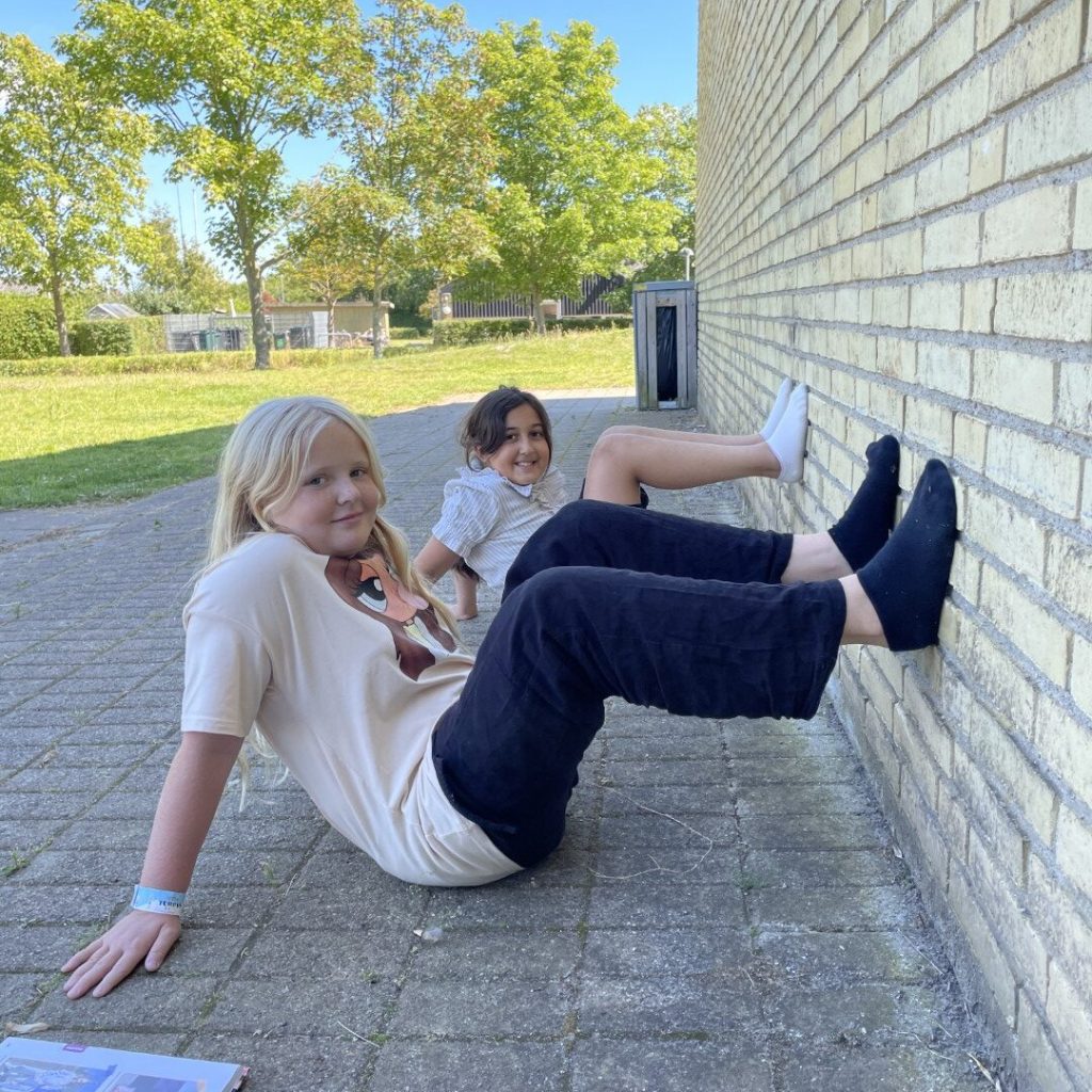 SIDDE – HÆNDER OG NUMSE PÅ JORDEN OG FØDDER PÅ VÆGGEN Necibe Cecik og Amalie Josephine Søfelt Bargaisen, begge 9 år, ville gerne slå en rekord og fandt på denne. De to piger sad op ad muren i præcis 30 minutter. “Godt kæmpet, piger,” siger vores kontrollant Kåre Ravnskov.